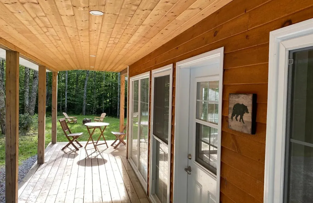 Die Villa in East Kemptville hat einen Patio und eine Essecke und bietet einen Blick auf die Terrasse. Zur Ausstattung des Badezimmers gehören eine getrennte Toilette und eine Dusche sowie ein Haartrockner und Handtücher.